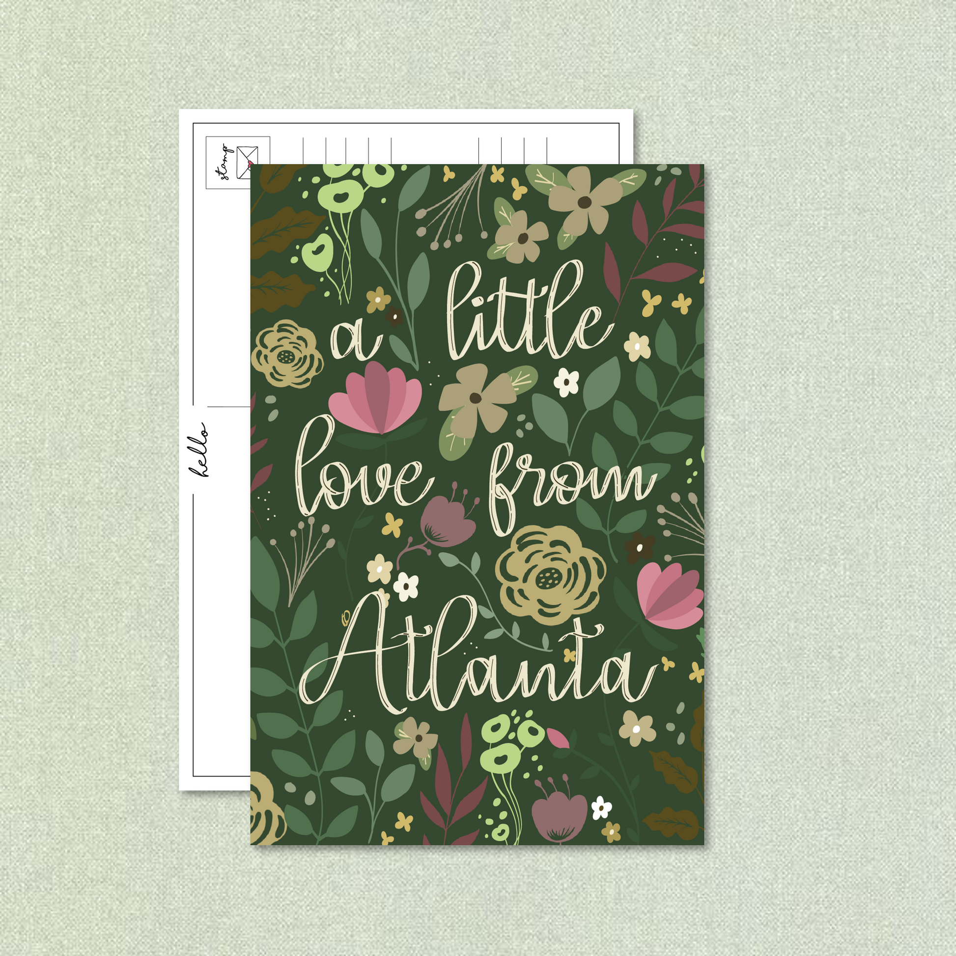 This postcard features a beautiful floral illustration that reads "A little love from Atlanta". The back of the postcard reads "hello" at the top and includes a place to write addresses and a personal note.