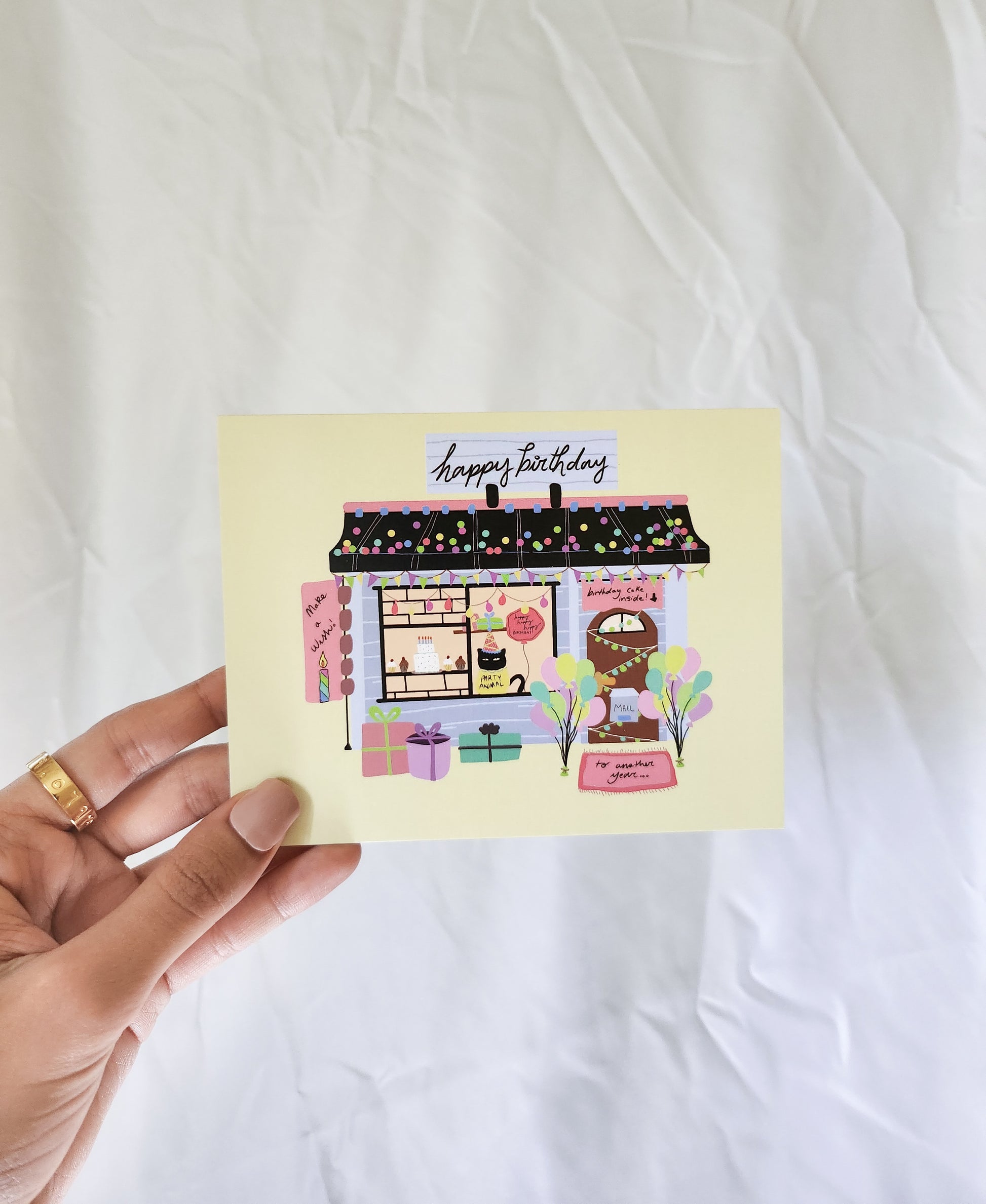 A beautiful greeting card with an illustration of a birthday theme shop front. Blank inside for your own personal message.