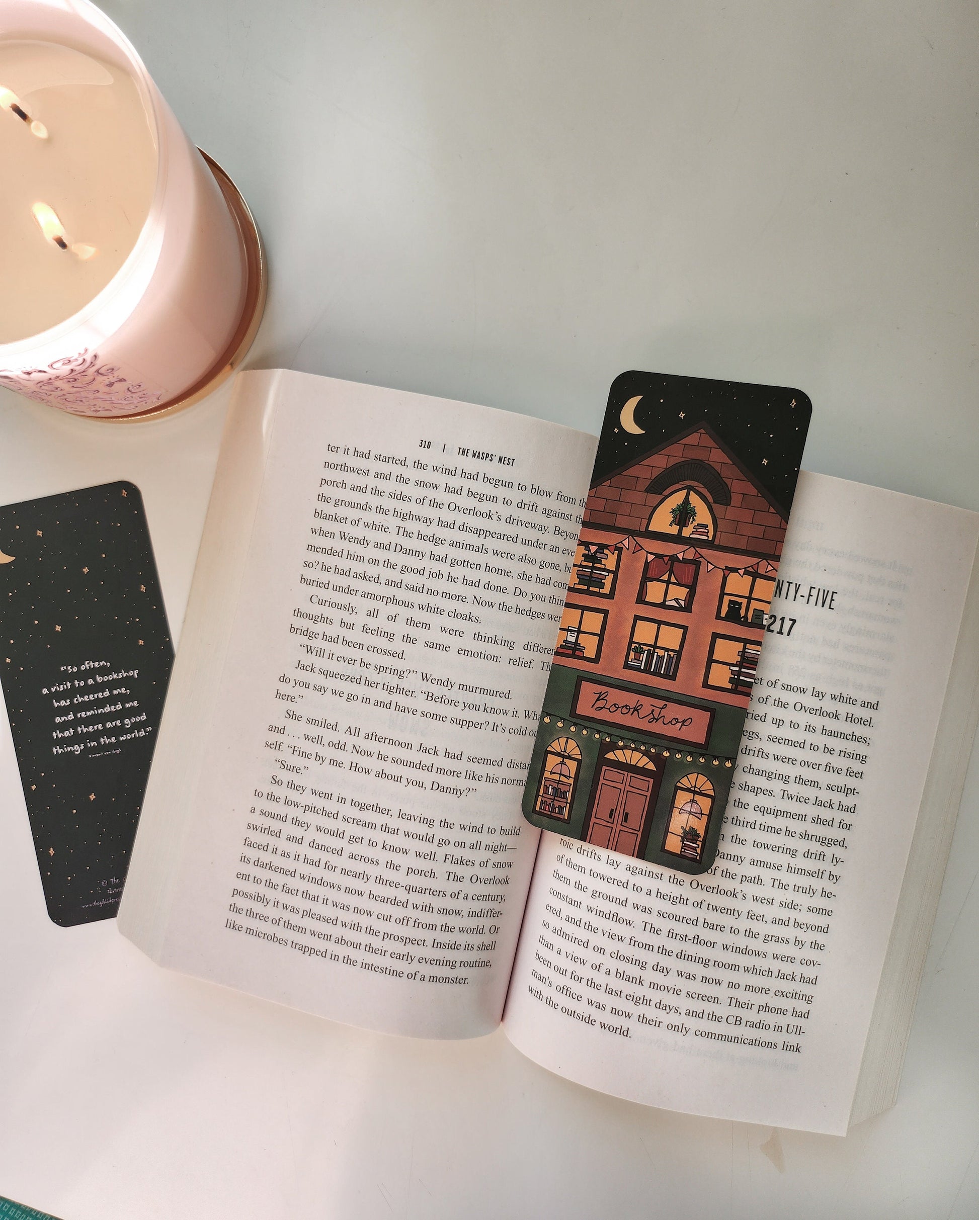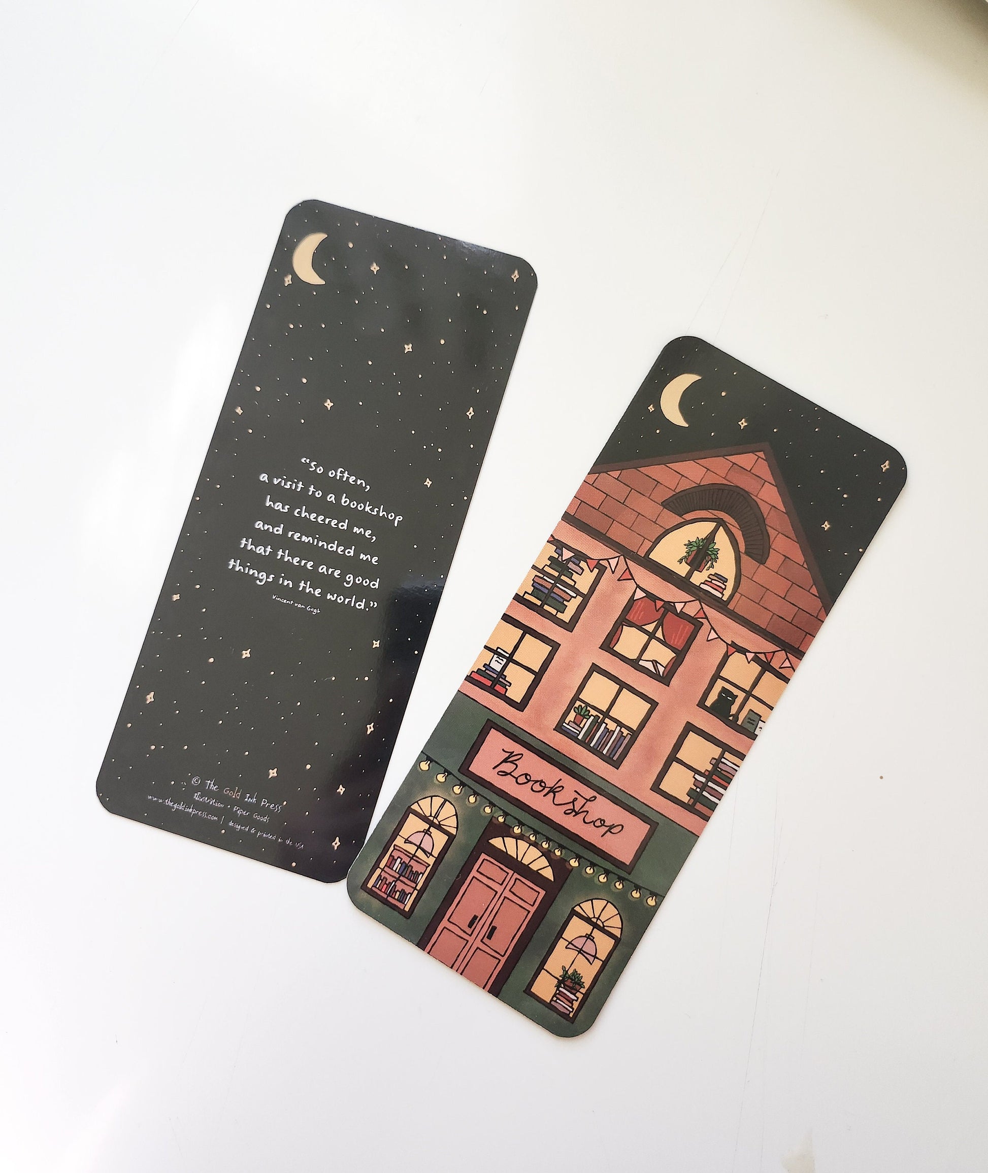 A beautiful book featuring an illustration of a cozy bookshop. The back reads a quote from Vincent van Gogh "So often, a visit to a bookshop has cheered me, and reminded me that there are good things in the world."