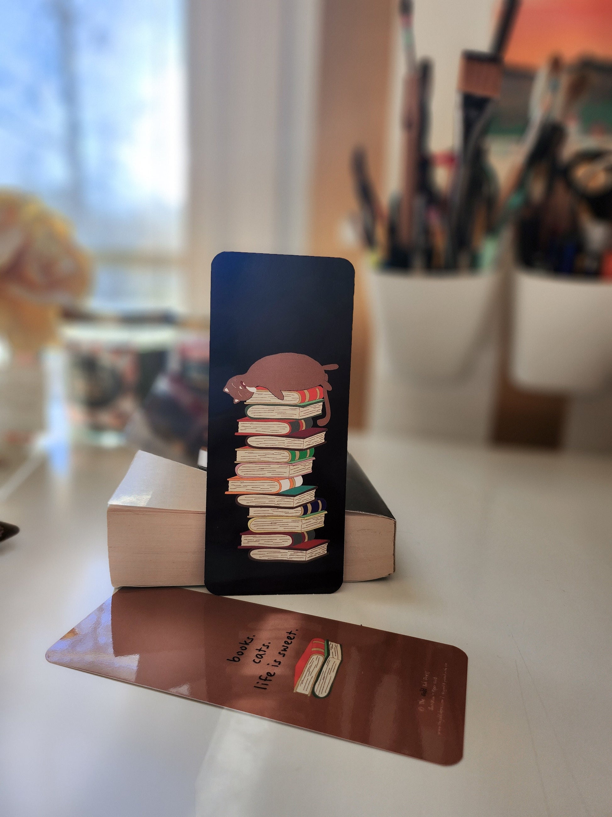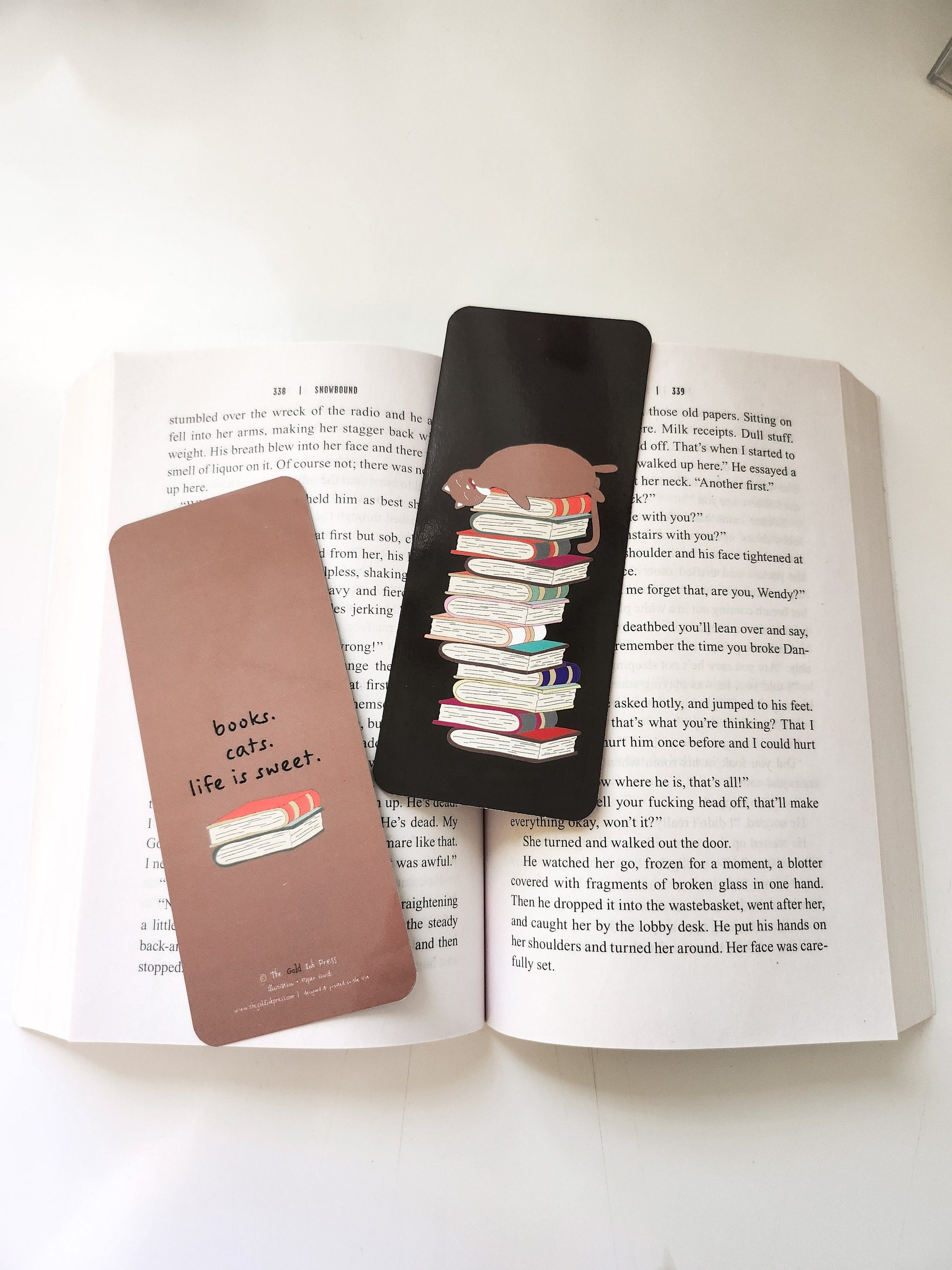 A beautiful book featuring a cat lounging on a stack of books. The back reads "Books. Cats. Life is sweet".