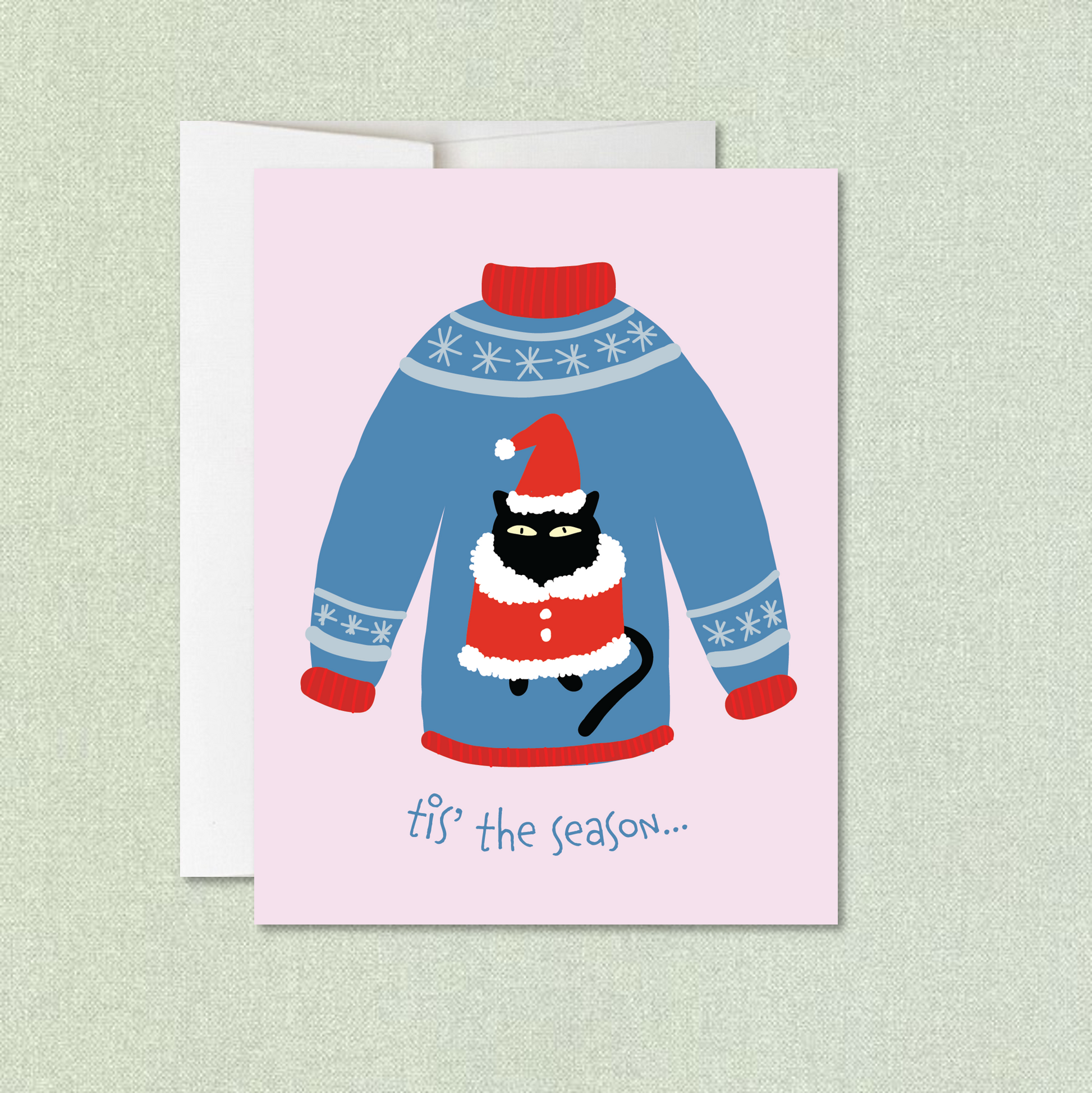 A fun greeting card with an illustration of a Christmas Sweater with a cat. Reads "Tis' the season" on the front. Blank inside for your own personal message.