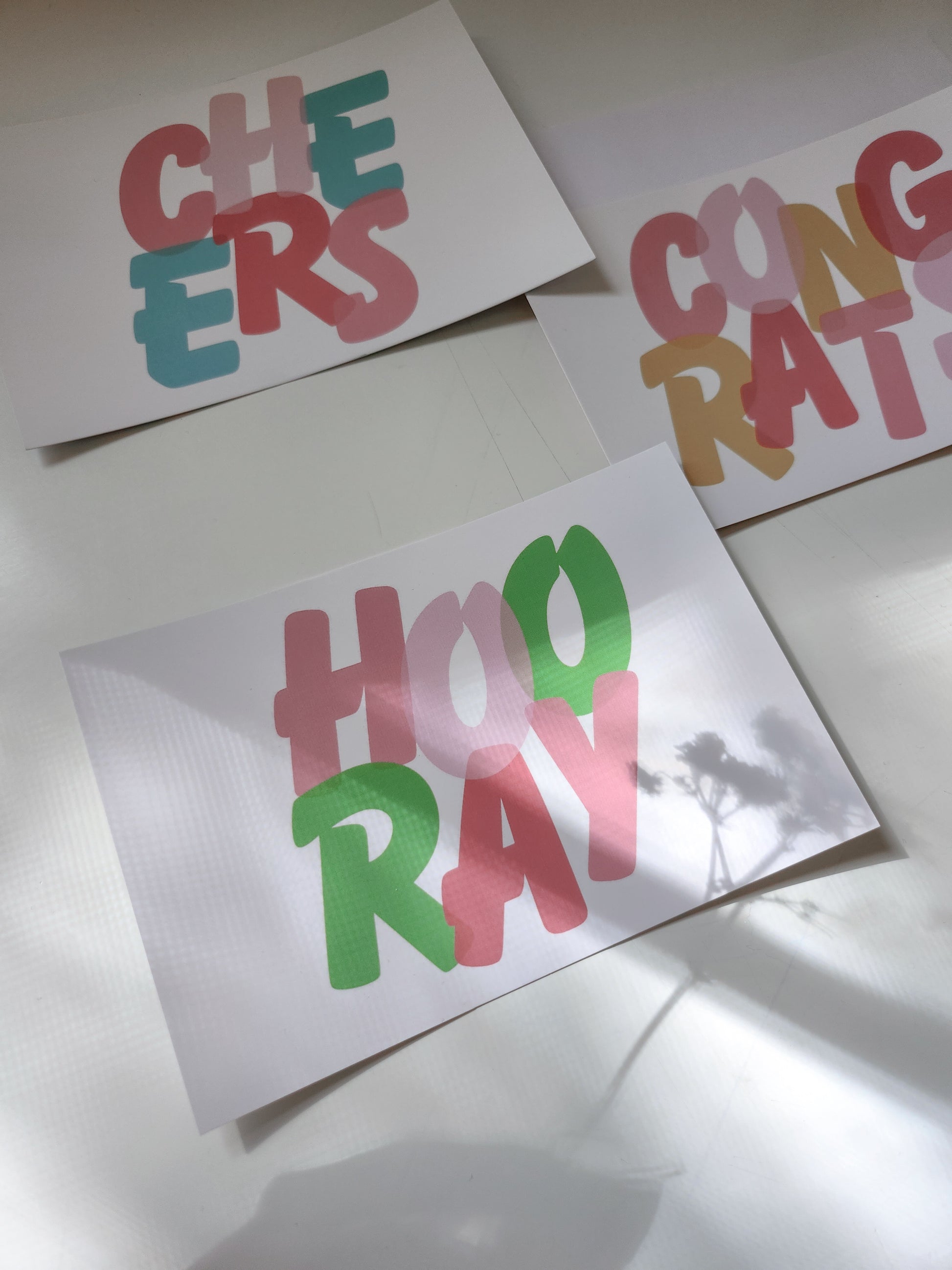 A beautiful set of three celebratory notecards with three different designs that read "hooray", "congrats", and "cheers"!