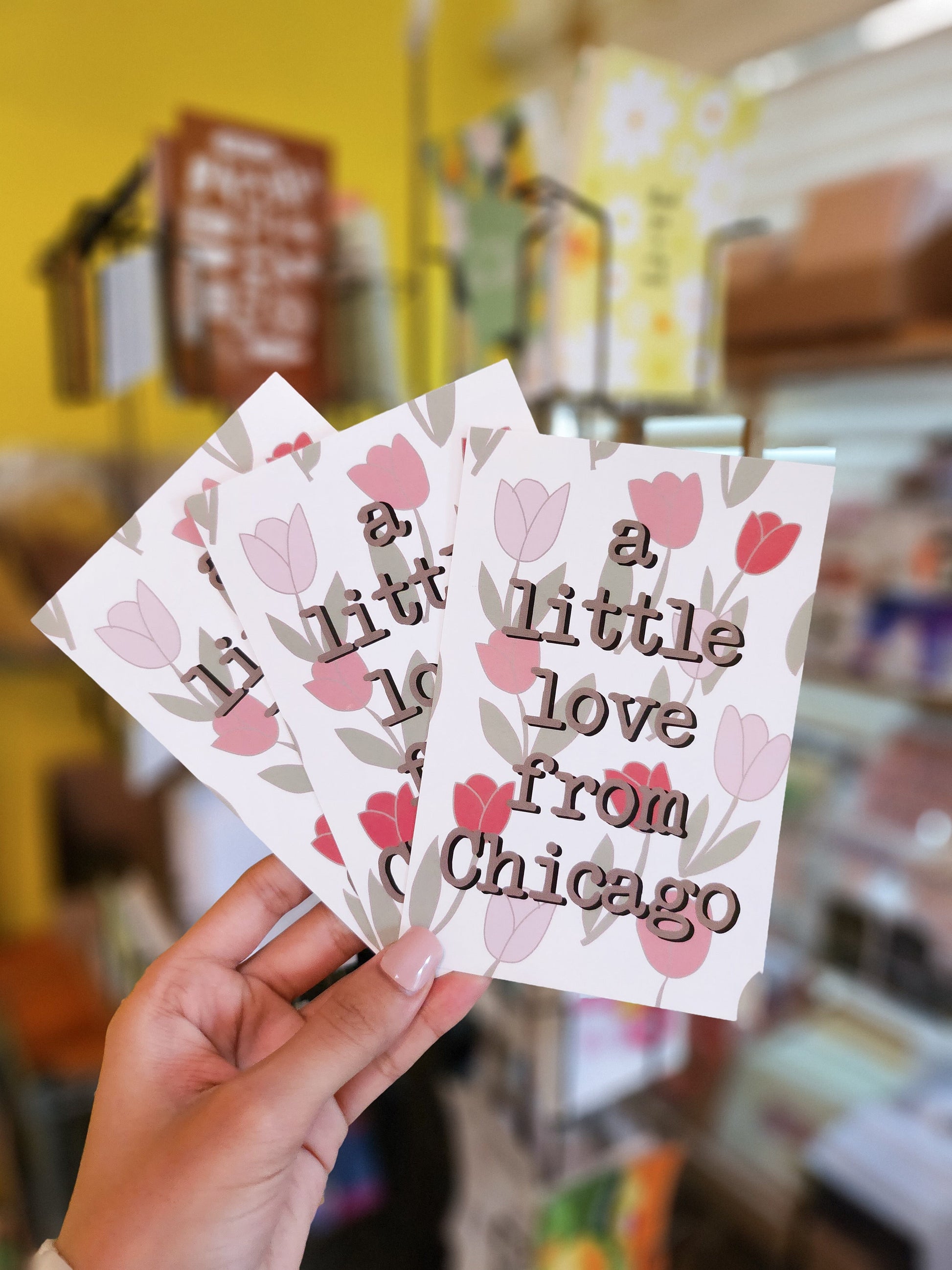 This postcard reads "a little love from Chicago" with beautiful iconic Chicago tulips in the background. The back of the postcard reads "hello" at the top and includes a place to write addresses and a personal note. Find more Illinois and Chicago postcards and stickers in the shop!
