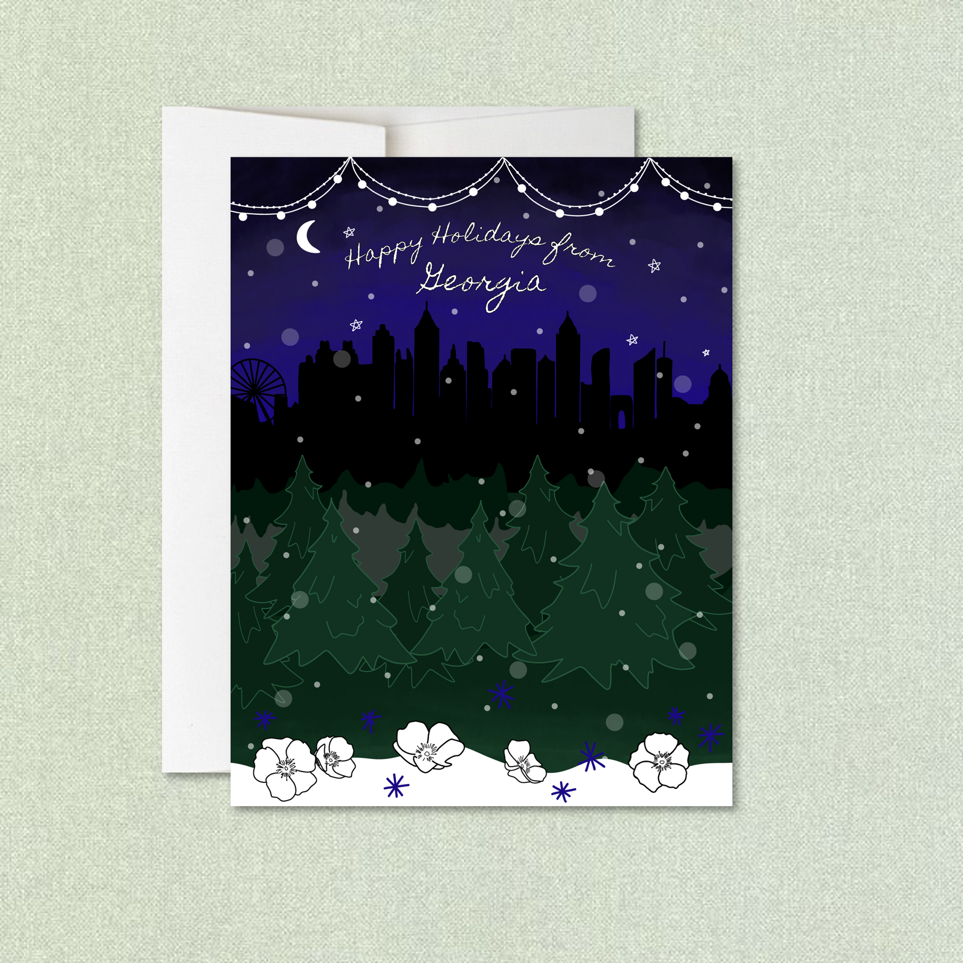 A beautiful greeting card with an illustration Georgia terrain and the Atlanta skyline. Reads "Happy Holidays from Georgia" on the front. Blank inside for your own personal message.