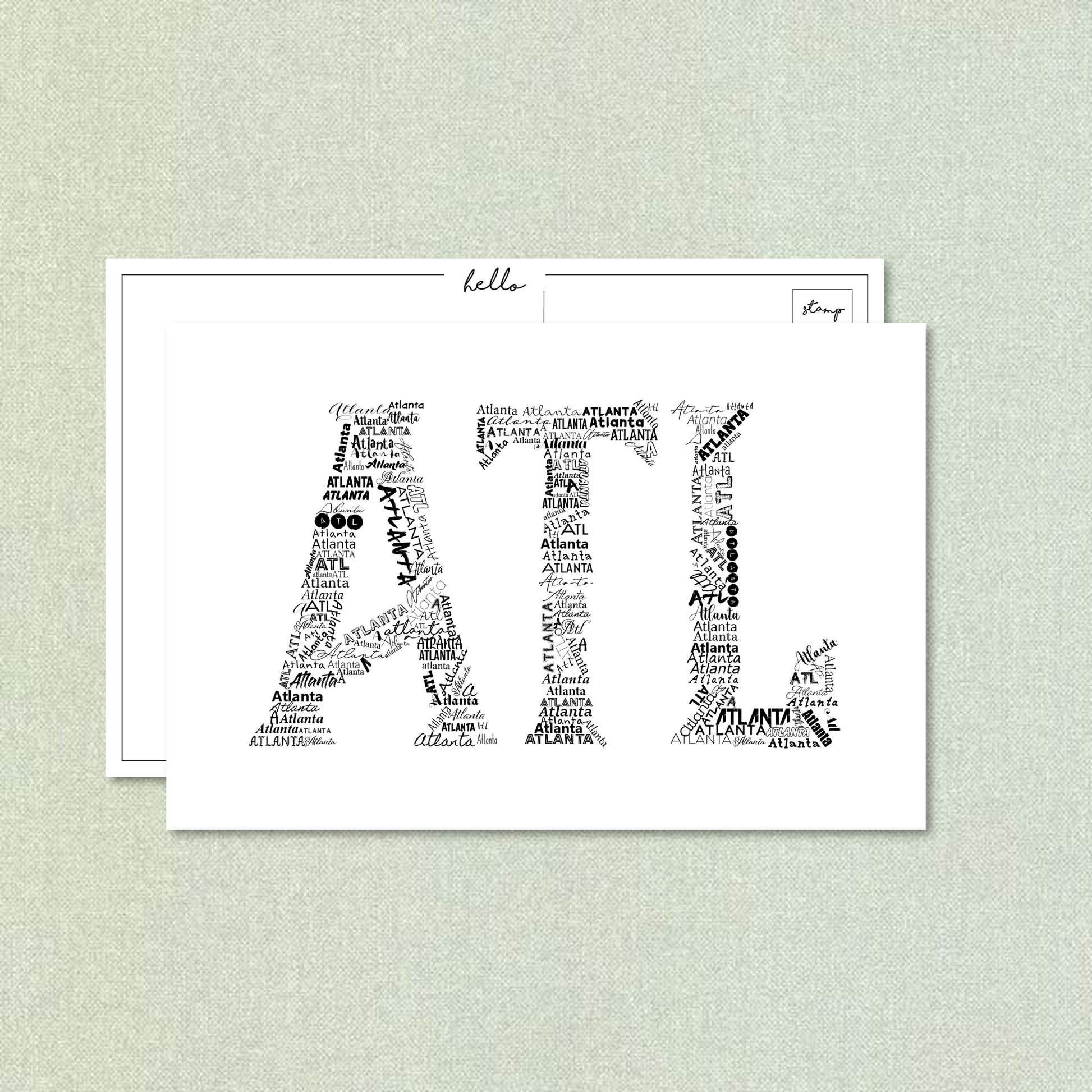 This postcard reads ATL in a unique typography style. The back of the postcard reads "hello" at the top and includes a place to write addresses and a personal note.