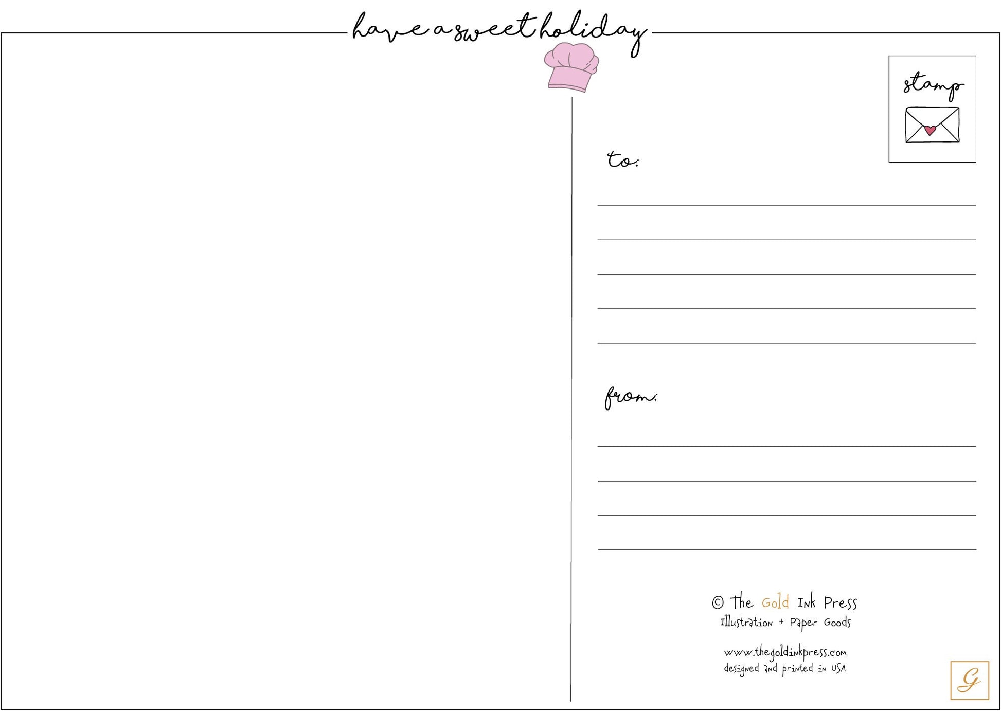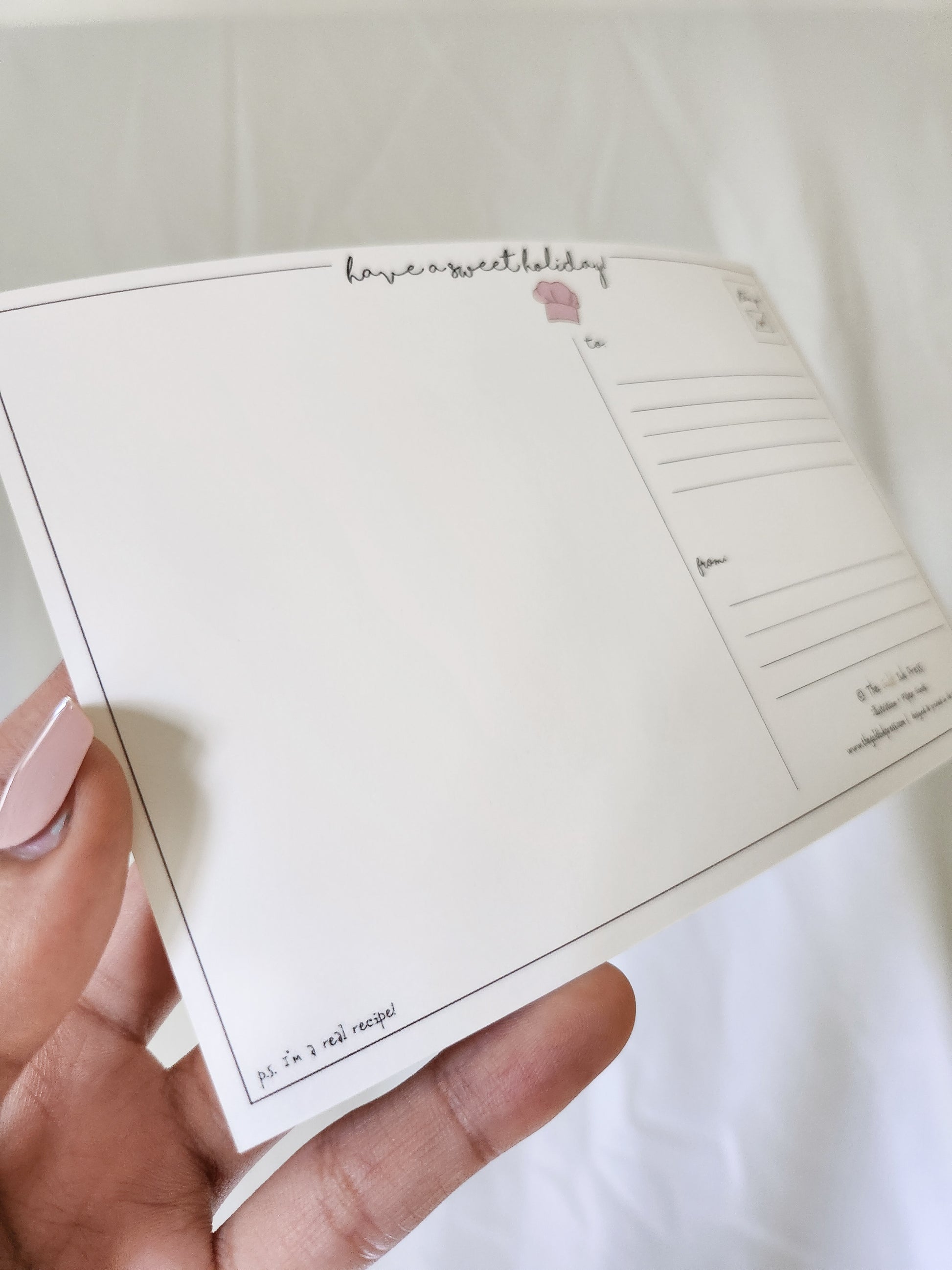 This postcard features a cute illustration of a gingerbread man holding a sign with an actual recipe for gingerbread cookies! The back of the postcard reads "Have a sweet holiday" and includes a place to write addresses and a personal note.
