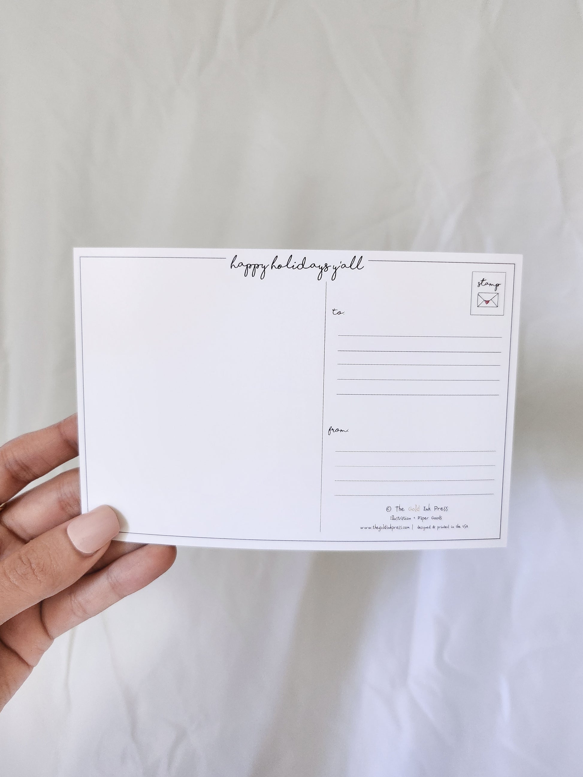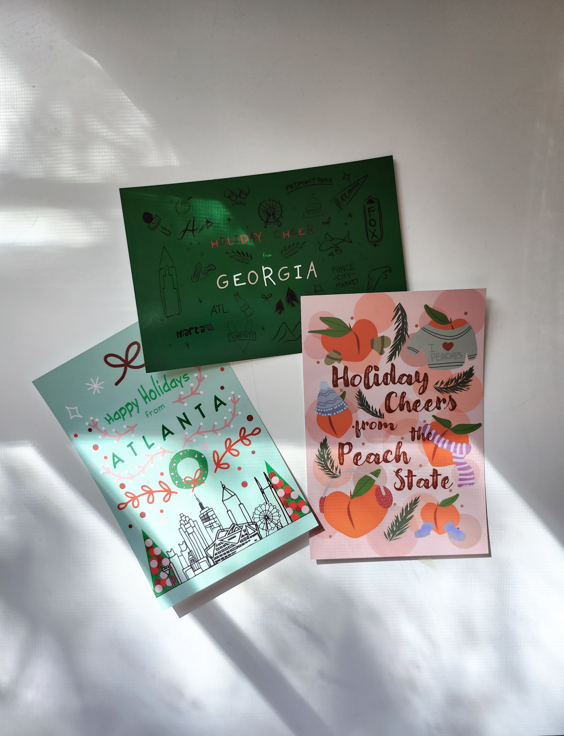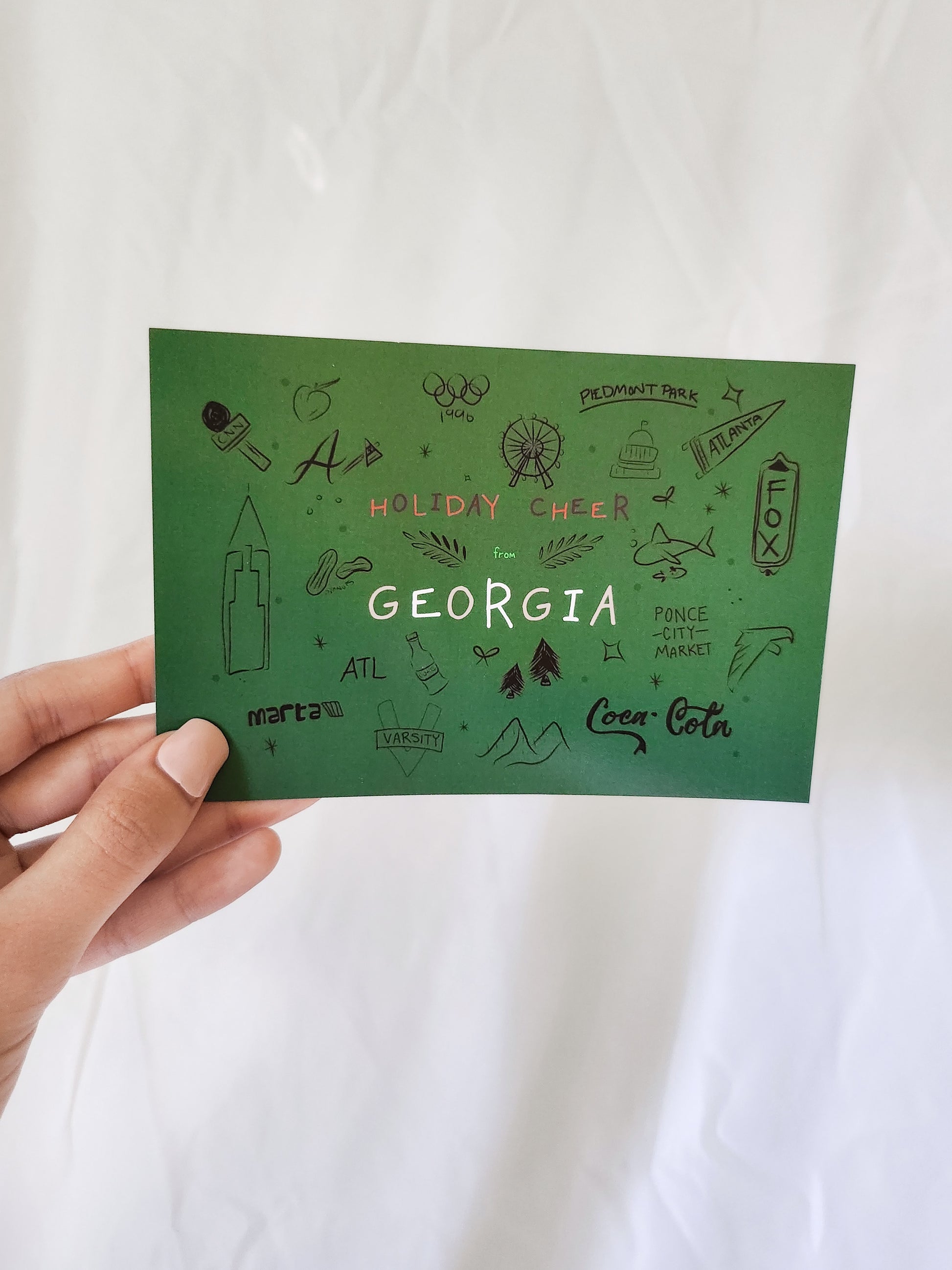 This postcard features a beautiful illustration with Georgia icons and reads " Holiday Cheer from Georgia". The back of the postcard reads "happy holidays y'all" and includes a place to write addresses and a personal note.