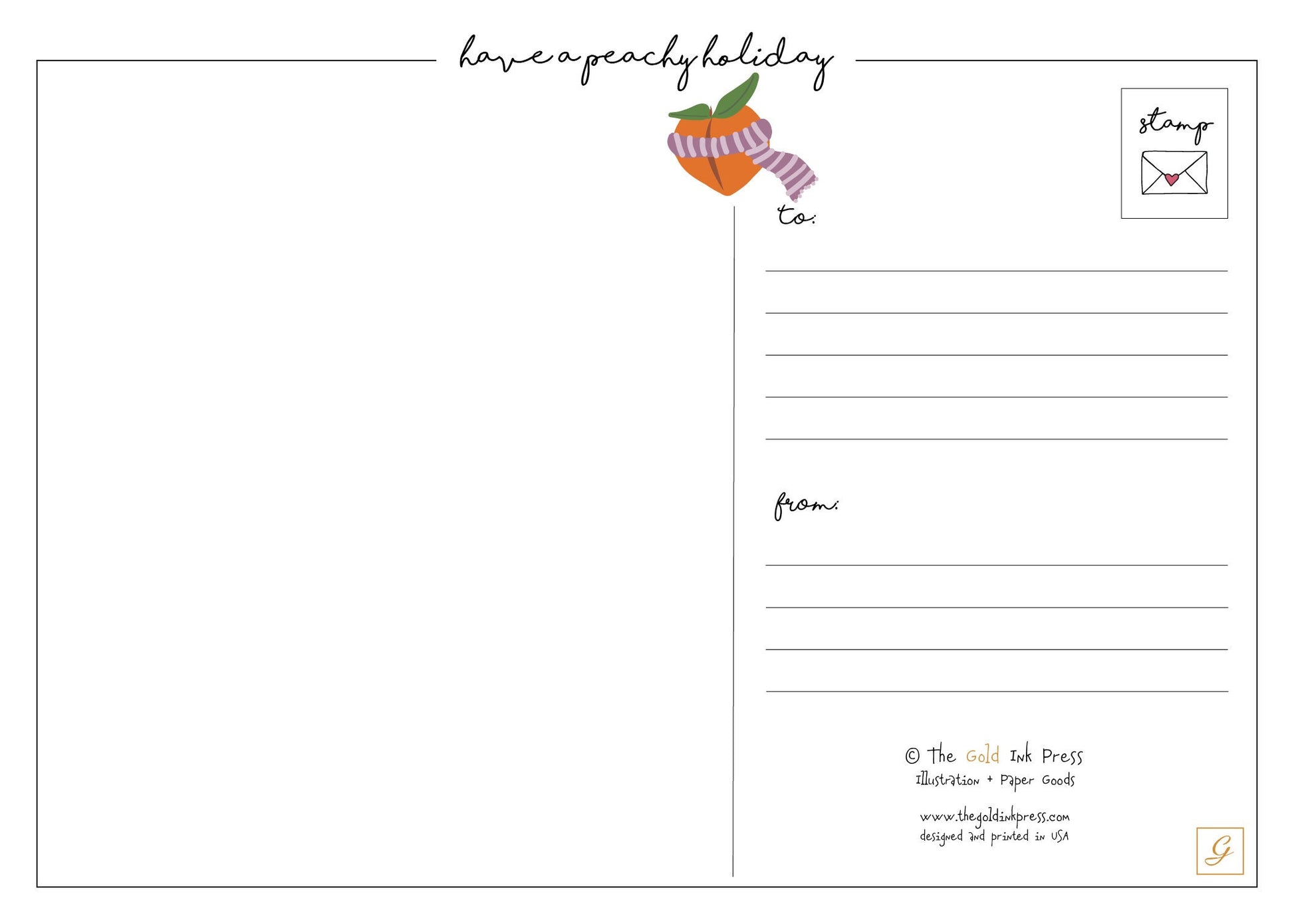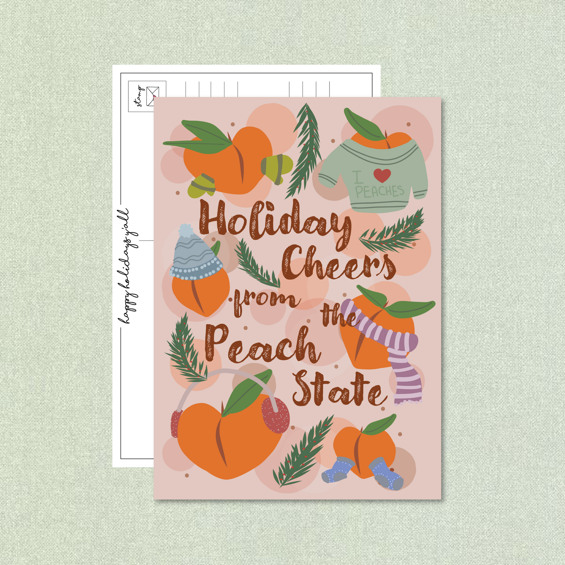 This postcard features a beautiful illustration of peaches (because GA is the peach state!) and reads "Holiday Cheers from the Peach State". The back of the postcard reads "have a peachy holiday" and includes a place to write addresses and a personal note.