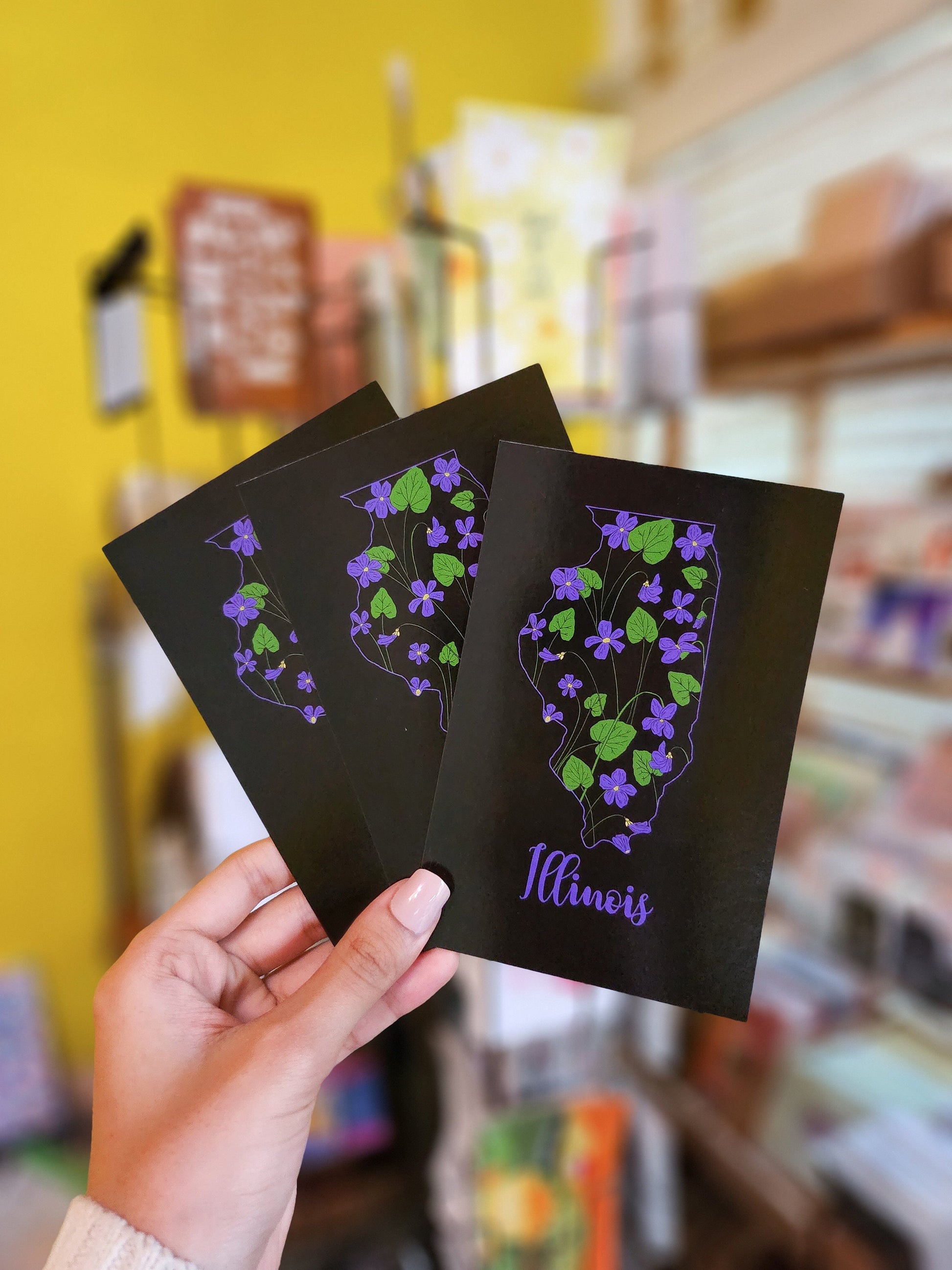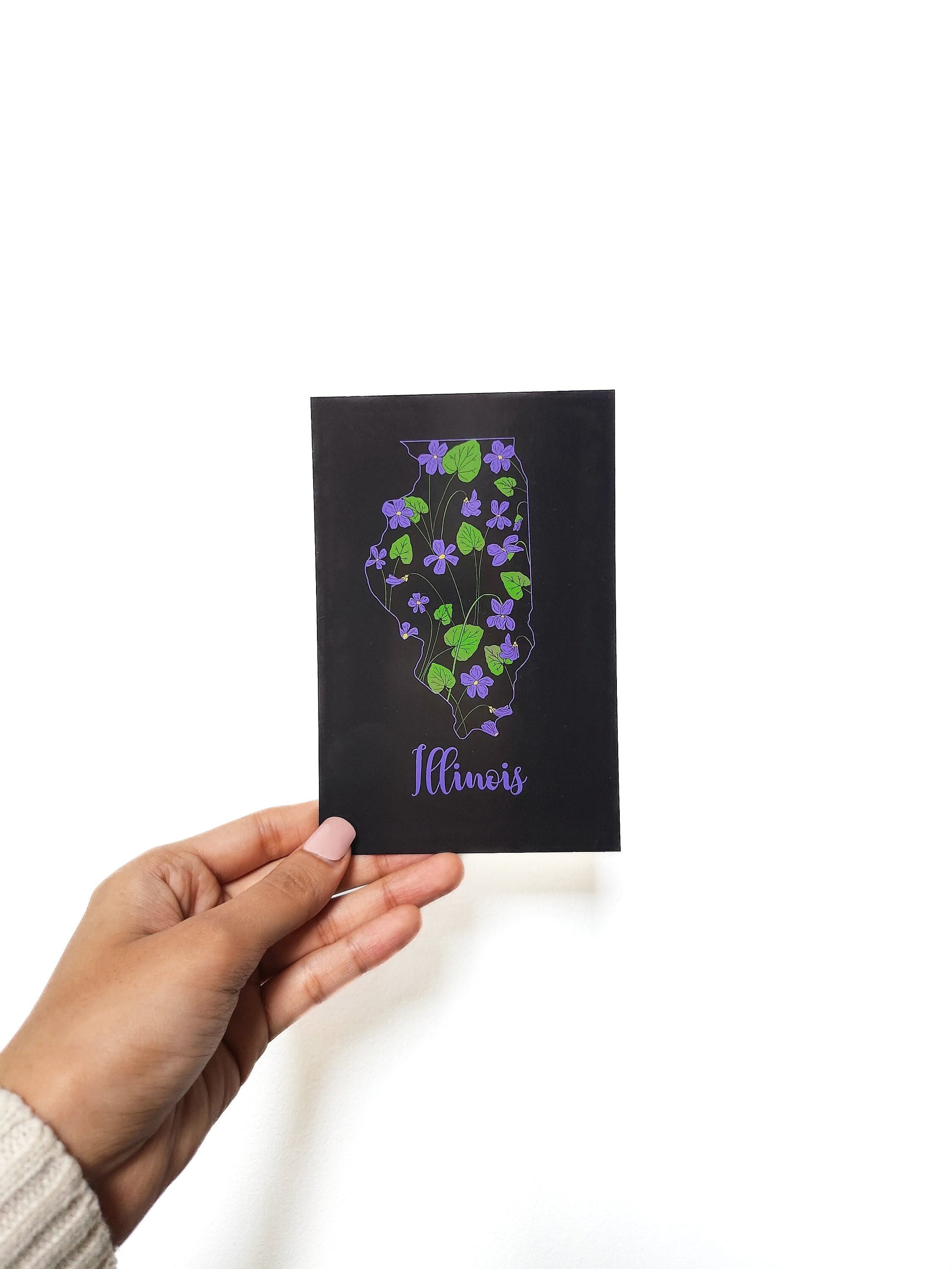 This postcard features an illustration with the shape of the state of Illinois and the state flowers (the violet). The back of the postcard reads "hello" at the top and includes a place to write addresses and a personal note. Find more Illinois and Chicago postcards and stickers in the shop!