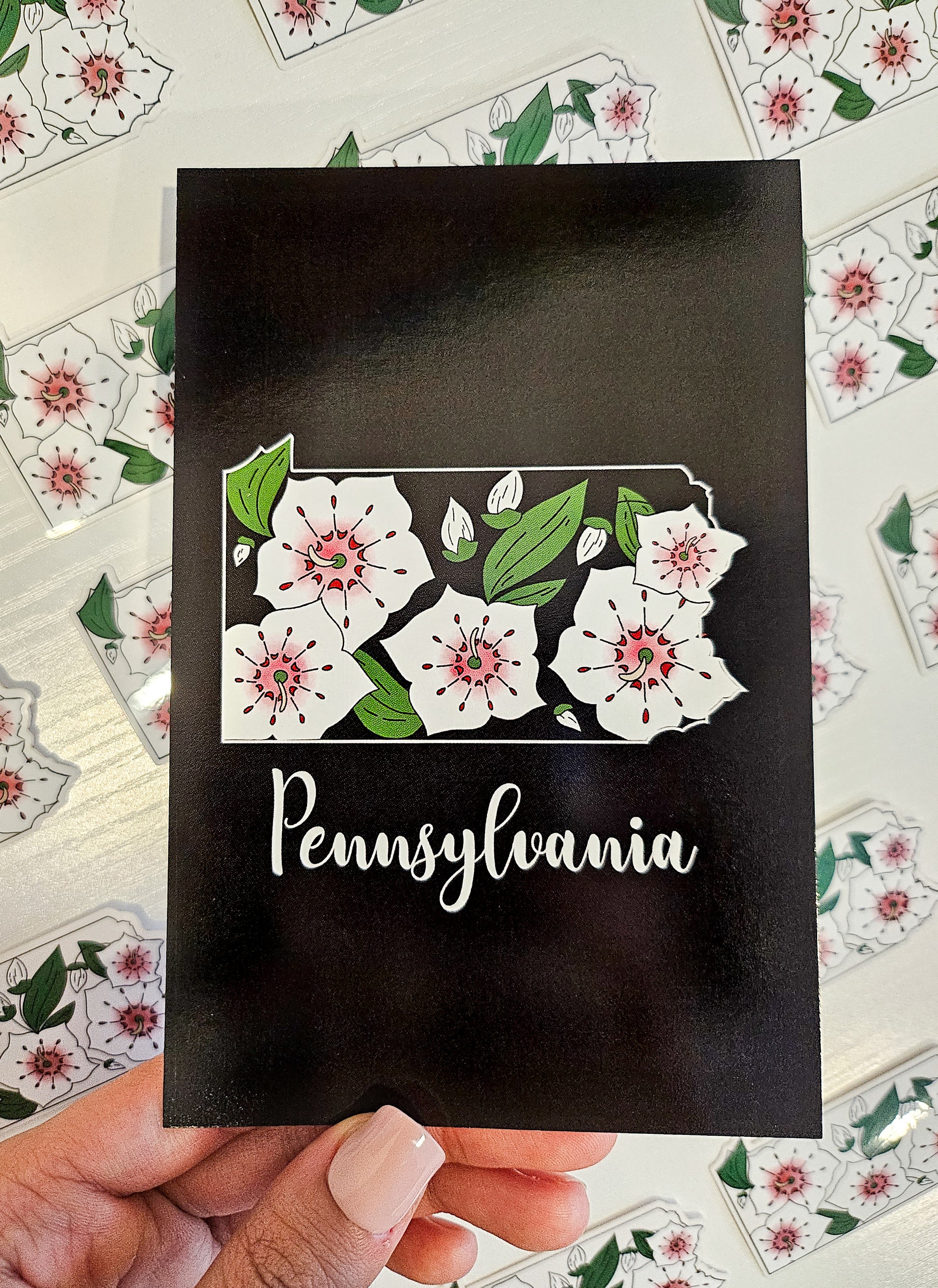 This postcard features an illustration of the outline of the state of Pennsylvania filled with the state flower! The back of the postcard reads "hello" at the top and includes a place to write addresses and a personal note. Find more Philadelphia and Pennsylvania postcards and stickers in the shop!