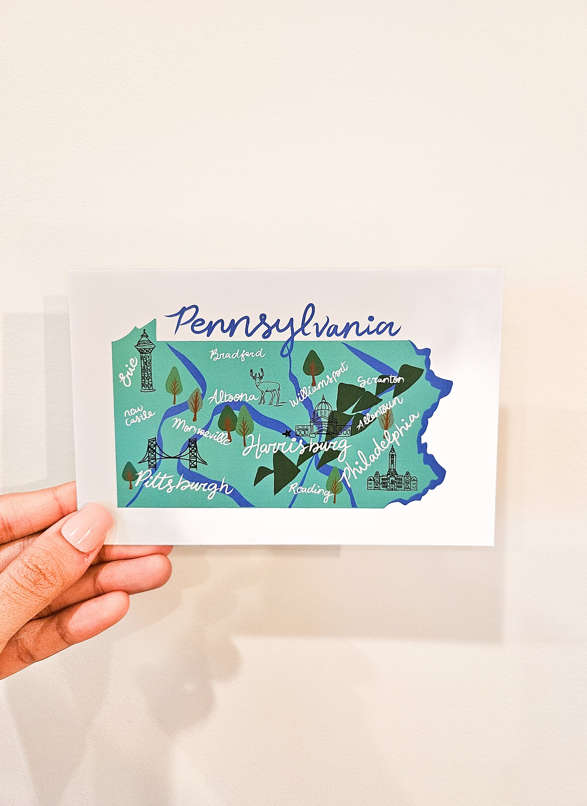 This postcard features an illustration of the state of Pennsylvania with city names and icons! The back of the postcard reads "hello" at the top and includes a place to write addresses and a personal note. Find more Philadelphia and Pennsylvania postcards and stickers in the shop!