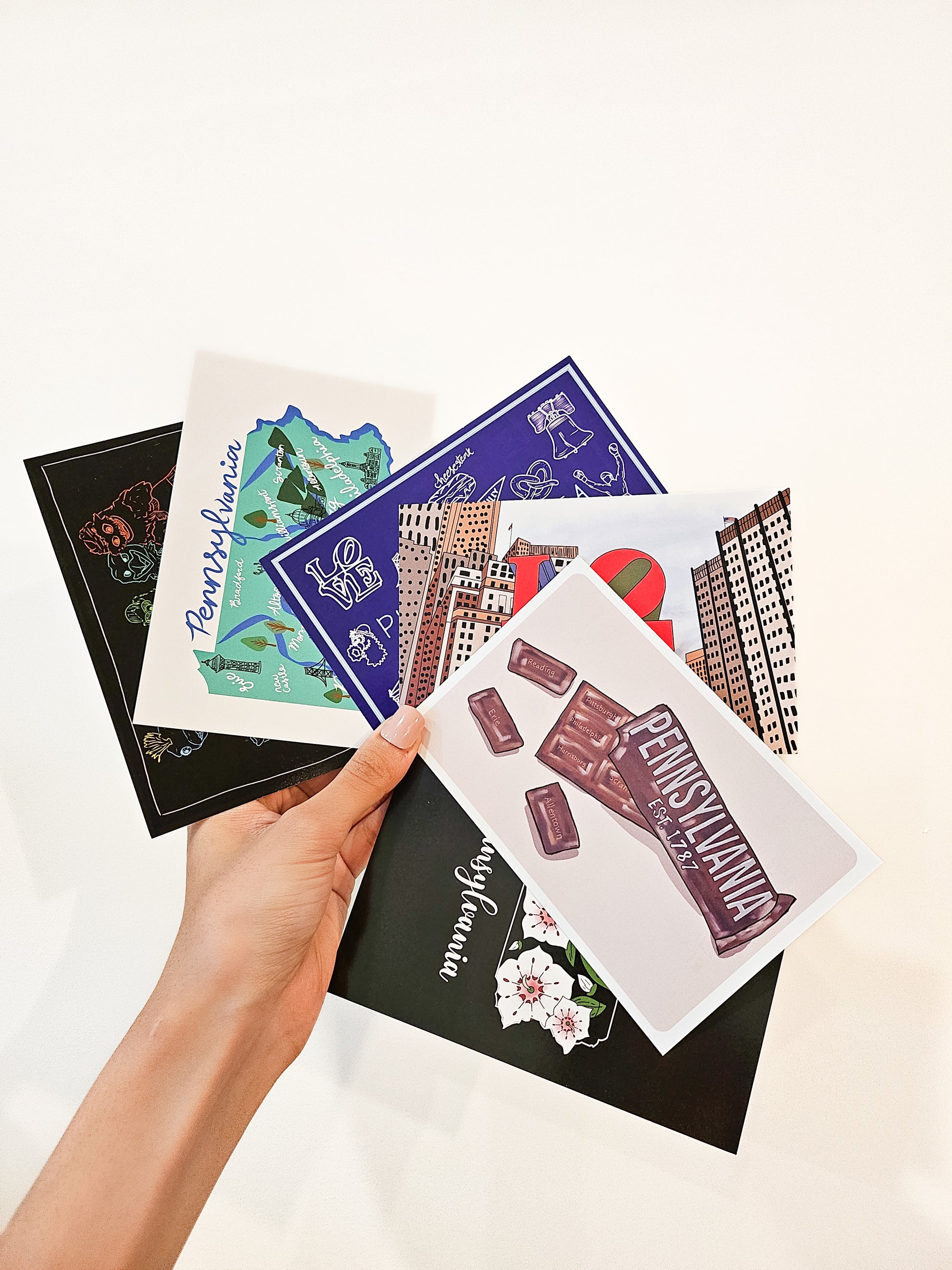 This postcard features an illustration with all the iconic Philadelphia mascots! The back of the postcard reads "hello" at the top and includes a place to write addresses and a personal note. Find more Philadelphia and Pennsylvania postcards and stickers in the shop!