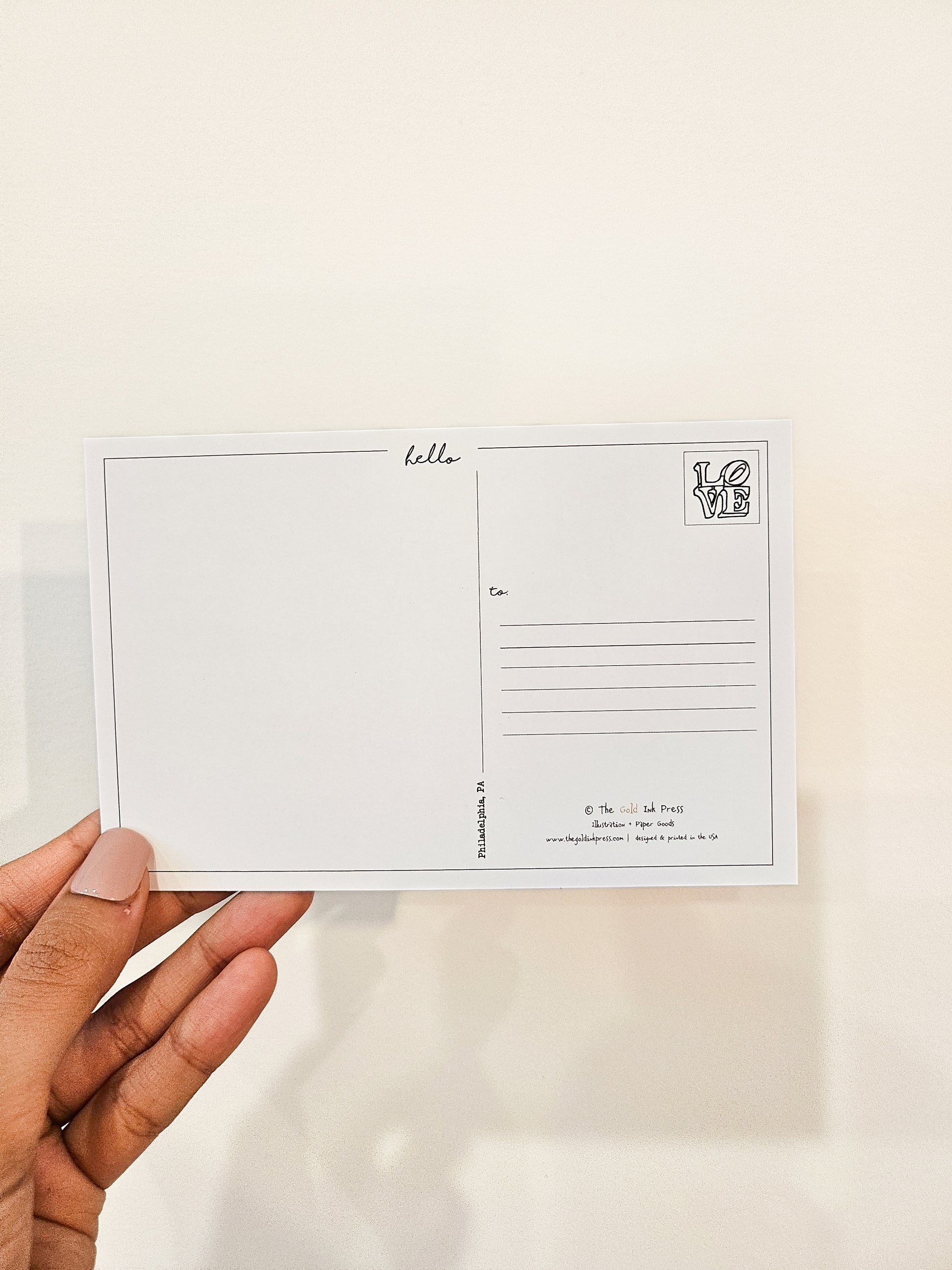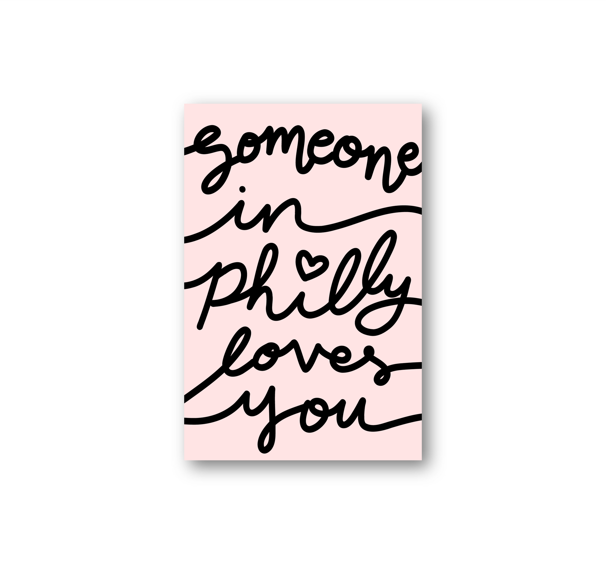 This postcard reads "someone in Philly loves you" in a beautiful lettering design. The back of the postcard reads "sending a little love" at the top and includes a place to write an address and a personal note.