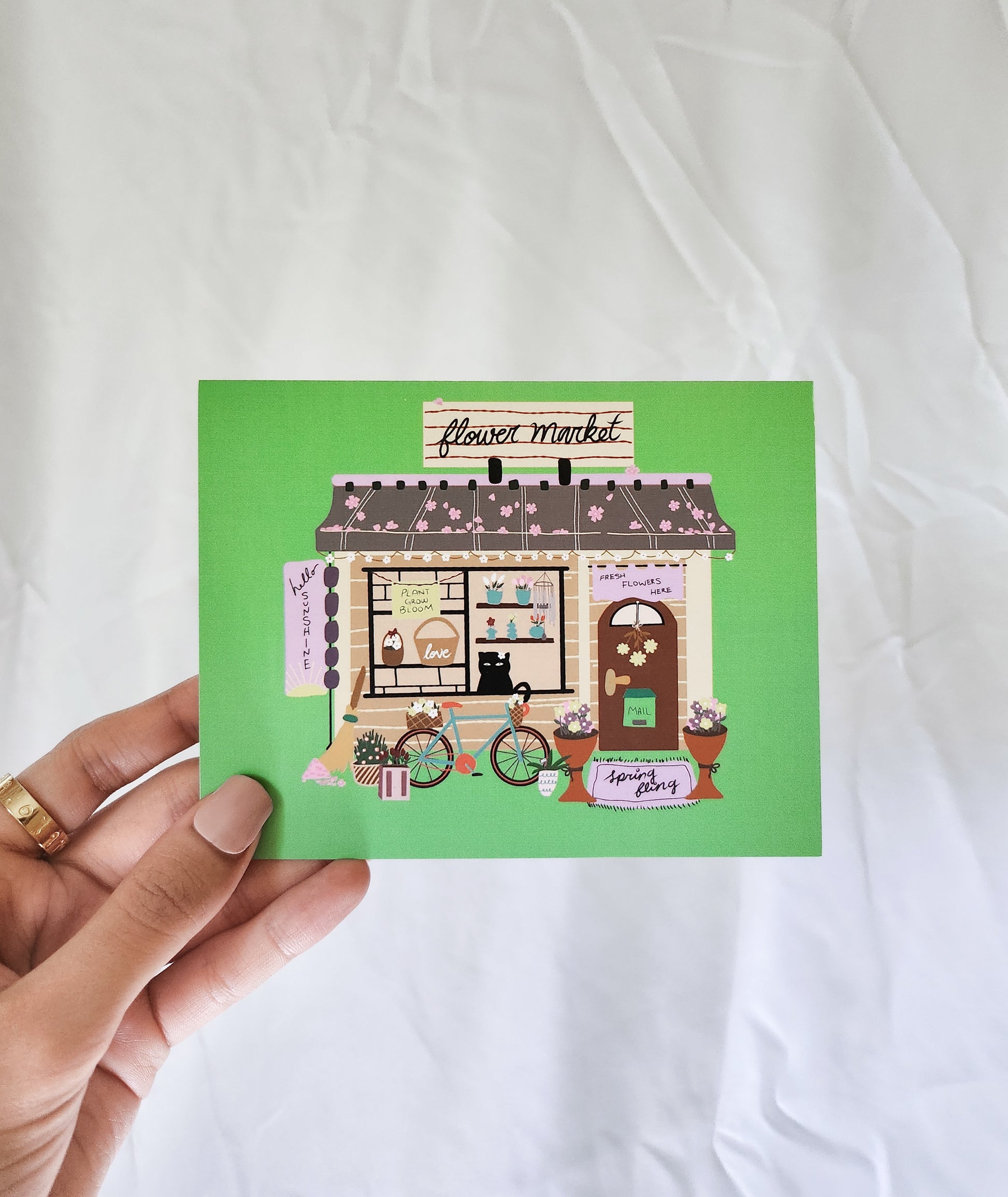 A beautiful greeting card with an illustration of a spring shop front. Blank inside for your own personal message.