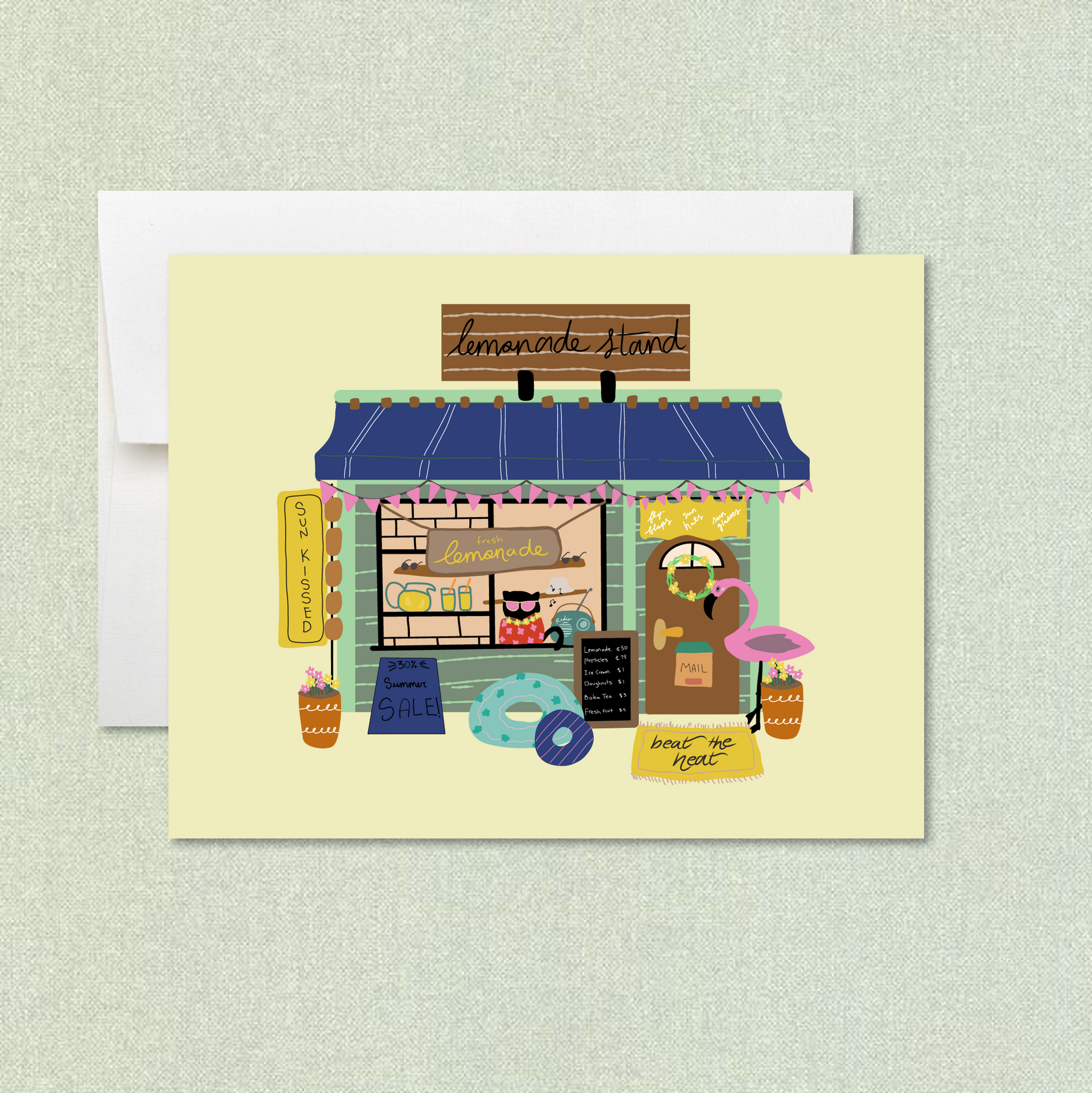 A beautiful greeting card with an illustration of a summer shop front. Blank inside for your own personal message.
