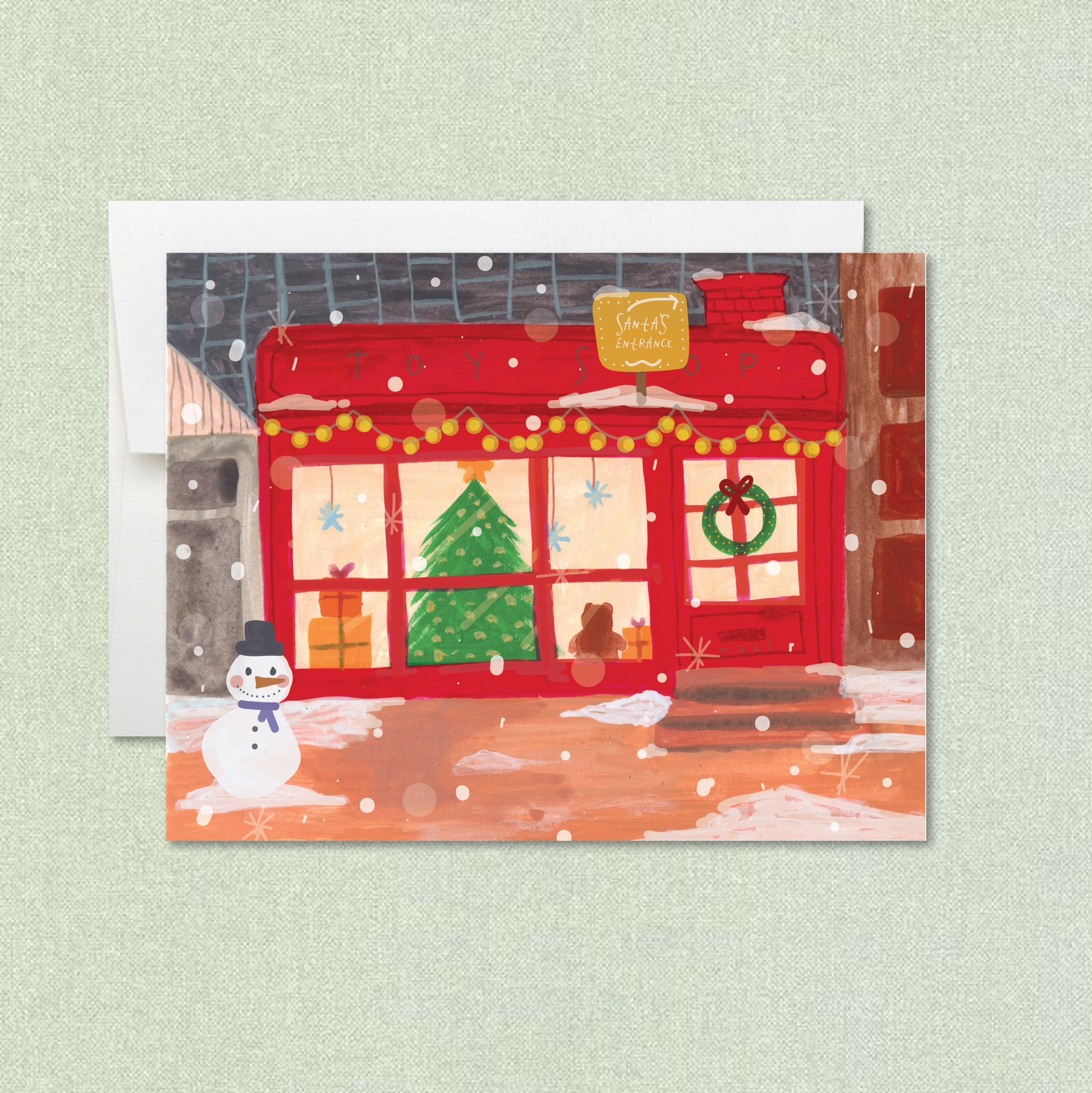 A beautiful greeting card with an illustration of Toy Shop on a winter day. Blank inside for your own personal message.