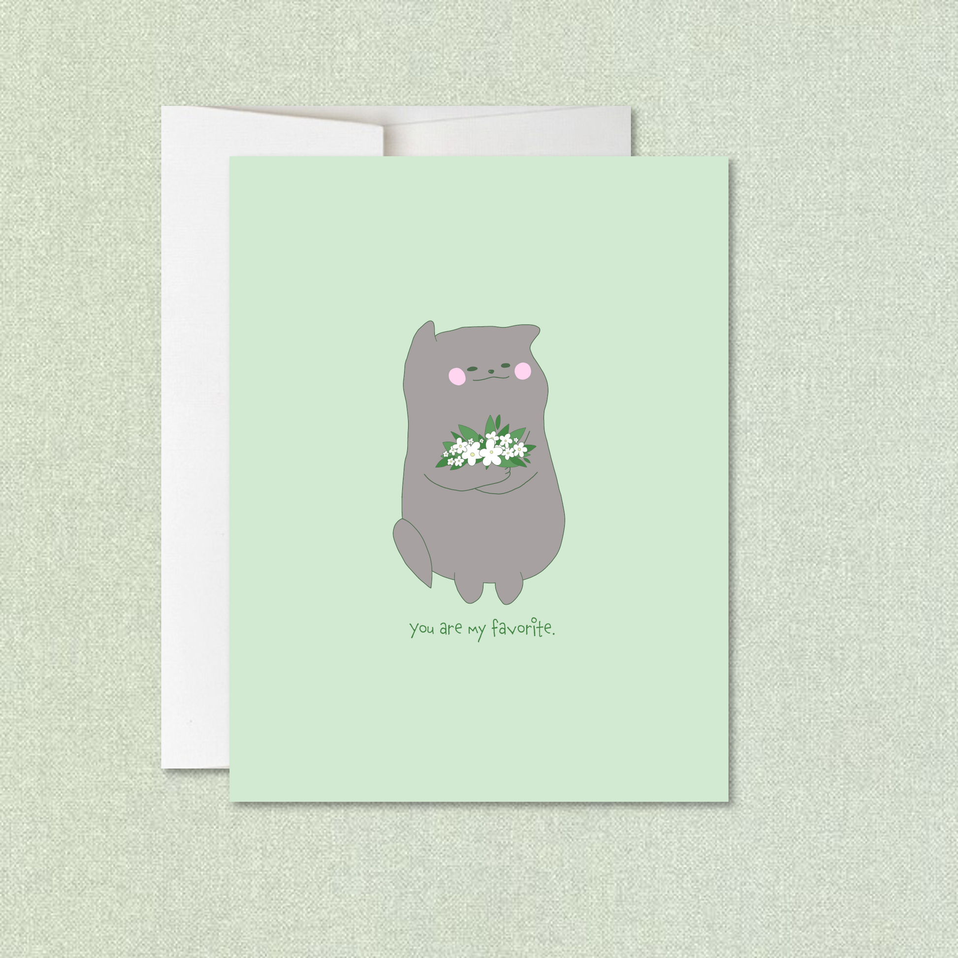 A beautiful greeting card with an of a cute cat holding flowers. Reads "You are my favorite" on the front. Blank inside for your own personal message.